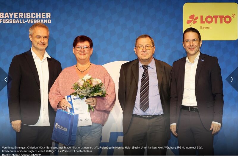Herzlichen Glückwunsch an Monika Heigl, stellv. Vorsitzende der JFG MDS, zur Ehrenamtspreisverleihung als Kreissiegerin des Fußballkreises Würzburg, im Münchner GOP Theater am 22.11.25. Im Bild mit Christian Wück, KEAB Helmut Wittiger und dem BFV Präsidententen Dr. Christoph Kern.